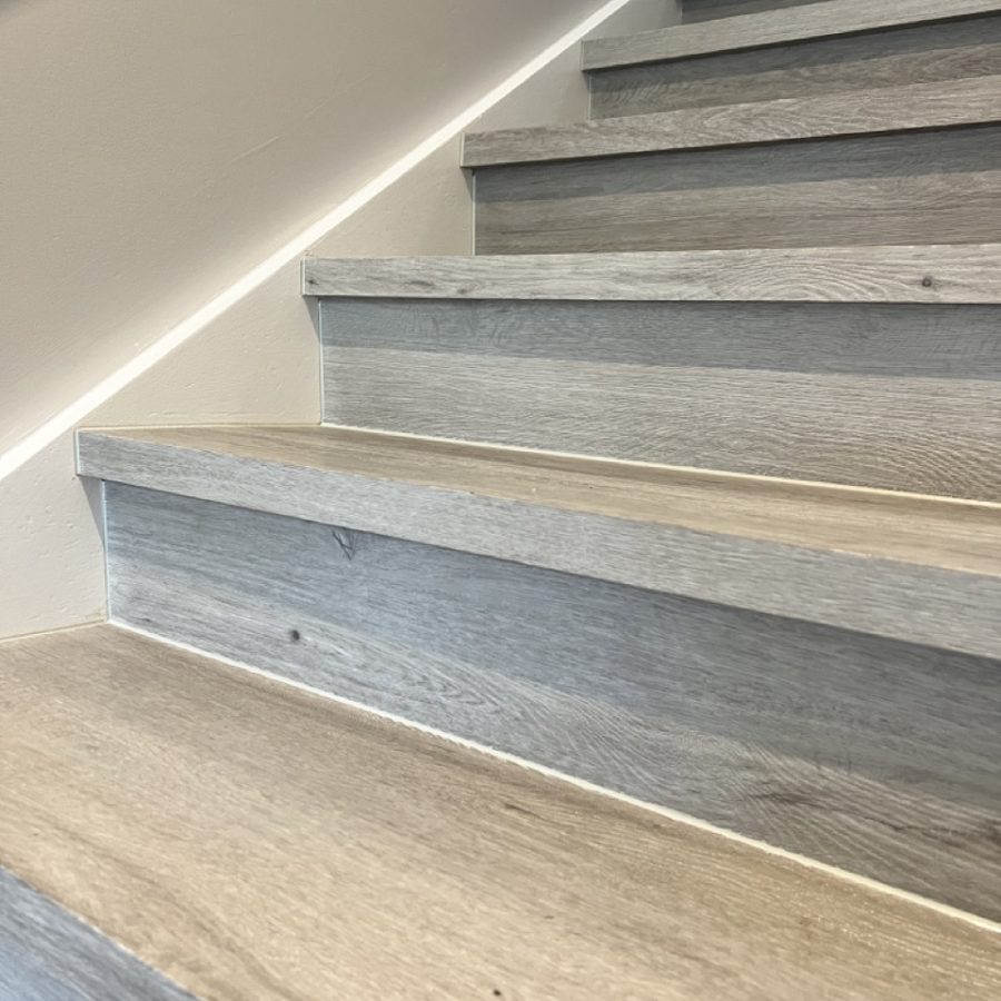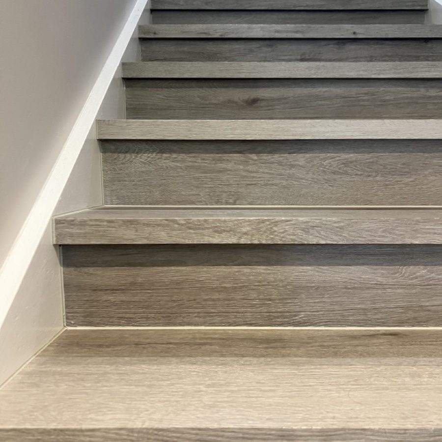 Wanting something that was hardwearing, waterproof, fade stain & scratch resistant he was extremely happy when we presented Aqua Stone V7. The colour way Oak Pearl was perfect for his home and after we discussed how we can have custom made “bullnose” stair nosings installed to his staircase he was absolutely thrilled!